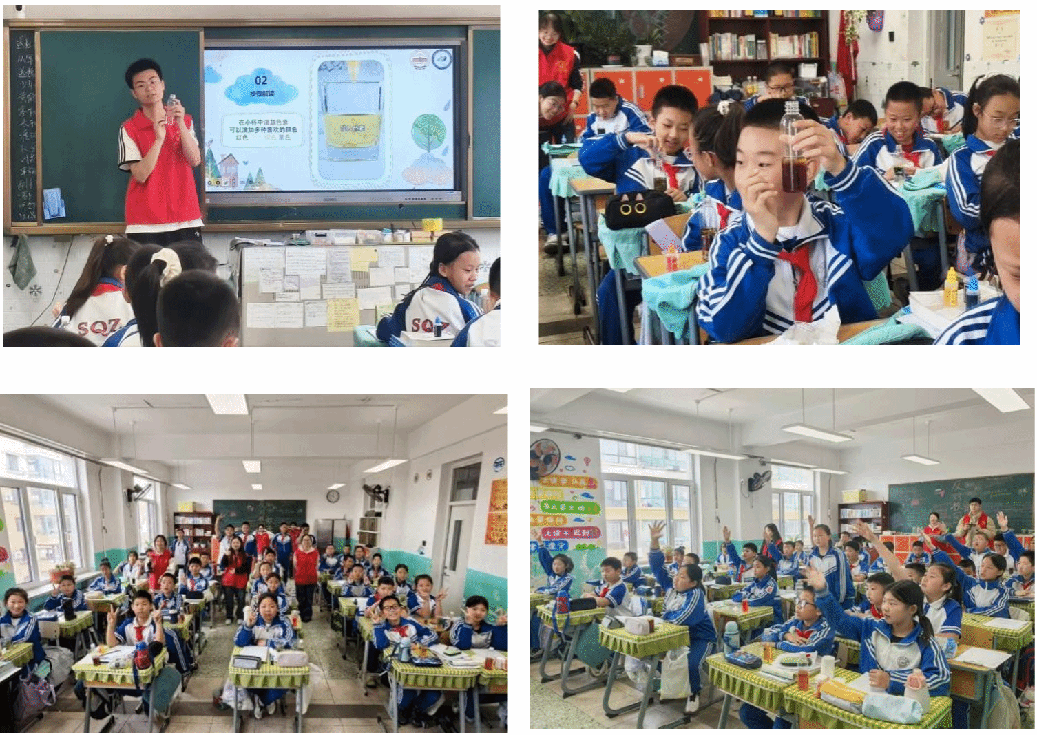 学生志愿者现场演示“彩虹雨”趣味化学实验,利用色素、食用油等材料,将专业知识以生动有趣的实验现象展示出来。讲解现场点燃了小学生们探索科学的热情,孩子们争先恐后的举手回答问题,教室里气氛热烈、掌声不断。