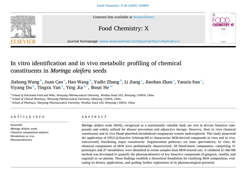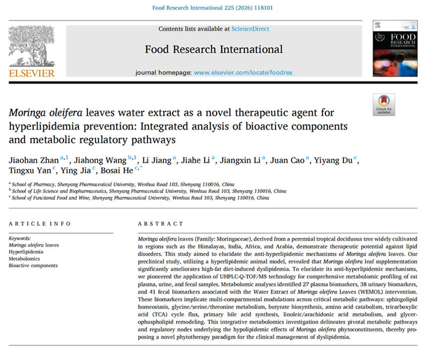 近日,沈阳药科大学功能食品与葡萄酒学院何博赛教授团队在辣木的系统研究方面取得系列进展。该团队围绕辣木的“活性成分解析—体内过程追踪—药理机制验证”这一完整研究链条,分别从辣木叶降血脂的多元代谢调控机制、辣木籽的化学成分与代谢谱系、以及辣木叶的化学成分与药物代谢动力学三个层面开展研究,为将辣木开发为功能性食品或降脂新药提供了扎实的科学依据。相关成果已连续在食品科学领域国际知名期刊《Food Research International》《Food Chemistry: X》上发表。