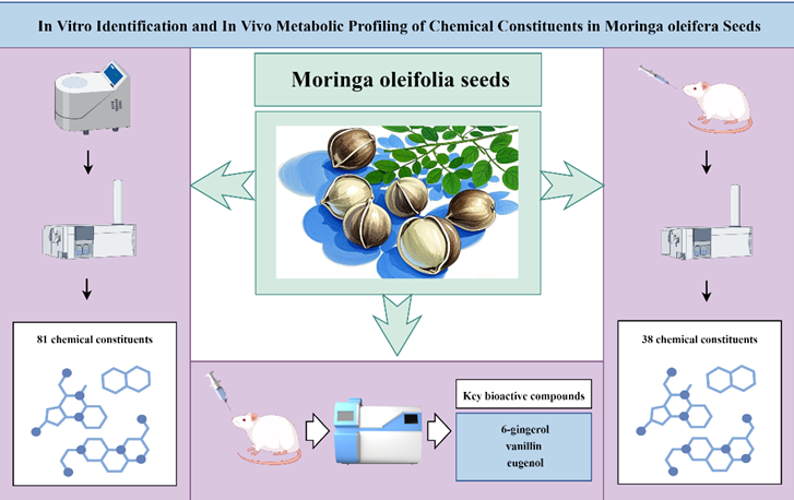 在辣木籽的化学成分与体内代谢谱研究方面,团队取得了基础解析的关键进展。研究采用UPLC-Q-Exactive Orbitrap-MS技术,对辣木籽水提物中的化学成分进行了系统鉴定,在体外共鉴定出81种化合物,并明确了芥子油苷等特征成分的质谱裂解规律。更为重要的是,通过分析给药后的大鼠血清,研究首次描绘了辣木籽的体内“代谢足迹”,共鉴定出38种血中移行成分(包括11种原型成分和27种代谢产物),揭示了其主要通过水解、结合反应进行代谢转化。团队还建立了灵敏可靠的LC-MS/MS方法,成功测定了其中3种关键活性成分在大鼠体内的药代动力学过程。这项研究为阐明辣木籽的药效物质基础及体内过程提供了全新视角。相关成果以《In vitro identification and in vivo metabolic profiling of chemical constituents in Moringa oleifera seeds》为题,发表于《Food Chemistry: X》(2025,中科院1区TOP,IF=8.2)。临床药学院王佳虹副教授为第一作者,贾英教授与何博赛教授为共同通讯作者。