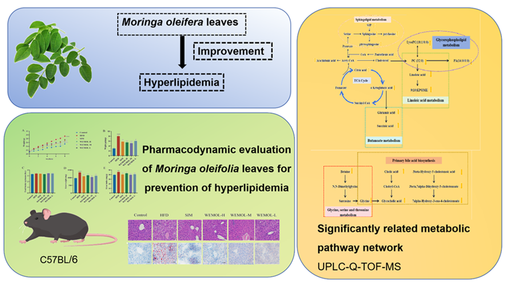 在辣木叶降血脂的多元代谢调控机制研究方面,团队通过构建高脂饮食诱导的小鼠模型,证实辣木叶水提取物能有效预防高脂血症,显著改善血脂水平与肝脏脂肪变性。为深入揭示其作用机制,团队运用先进的UHPLC-Q-TOF/MS代谢组学技术,从小鼠的血浆、尿液和粪便中精准筛选出106个与辣木叶干预相关的差异代谢物。分析表明,辣木叶的降脂功效是通过多靶点、多通路协同实现的,包括调节鞘脂代谢平衡、促进胆固醇向胆汁酸转化并排泄、修复三羧酸循环能量代谢等。该研究从系统生物学角度,完整阐释了辣木叶作为一种新型植物疗法调控血脂紊乱的多元代谢网络。相关论文《Moringa oleifera leaves water extract as a novel therapeutic agent for hyperlipidemia prevention: Integrated analysis of bioactive components and metabolic regulatory pathways》发表于《Food Research International》(2026,中科院1区TOP,IF=8.0)。2023级药物分析硕士研究生战姣含和临床药学院王佳虹副教授为论文共同第一作者,何博赛教授为通讯作者。